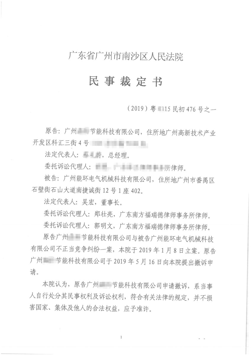 然而,該節能科技有限公司無(wú)視我司的善意與忍讓?zhuān)溆?/span>2019年1月向南沙區人民法院起訴我司涉嫌不正當競爭,并且要求撤下我司在官網(wǎng)上發(fā)布的關(guān)于撤銷(xiāo)上述公告函的通告。為維護我司的合法權益,我司在庭前提供相關(guān)證據材料,并在庭審過(guò)程中進(jìn)行了充分舉證。庭審過(guò)程中舉證的證據材料足以證實(shí)該節能科技有限公司盜用了我司的產(chǎn)品、業(yè)績(jì)圖片。在該案未判決前,該節能科技有限公司策略性的選擇撤訴,南沙區人民法院已準許該節能科技有限公司的撤訴申請,并作出相應的準予撤訴裁定書(shū)。